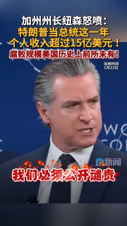 当地时间1月22日,加利福尼亚州州长加文·纽森在达沃斯论坛上曝出特朗普在过去12个月里个人收入超过15亿美元,怒批特朗普的腐败和贪污规模是美国历史上前所未有的。#美国 #特朗普 #纽森 #达沃斯论坛