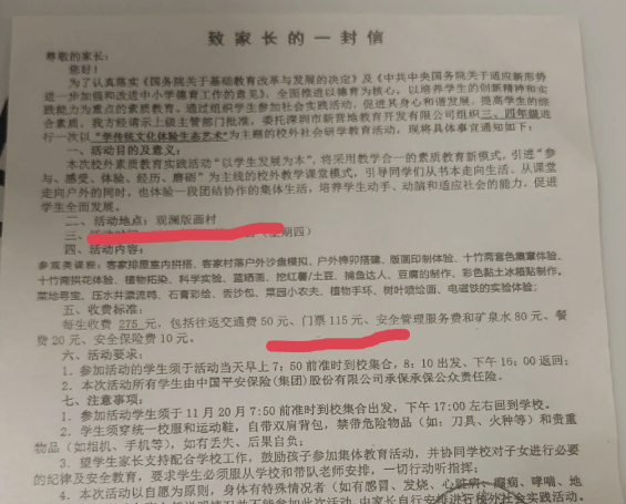 近日,有网友在“问政深圳”平台发帖反映,深圳市宝安区某小学的《致家长的一封信》信中显示学校组织三、四年级学生前往观澜版画村开展校外研学活动,每人收费275元,其中门票费用占115元。
