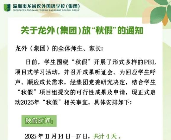 日前,深圳新闻网记者就此致电深圳市教育局了解相关情况。相关负责人表示,在春秋假期的安排上,深圳全市层面不作统一安排,但鼓励有条件的区、校探索开展。